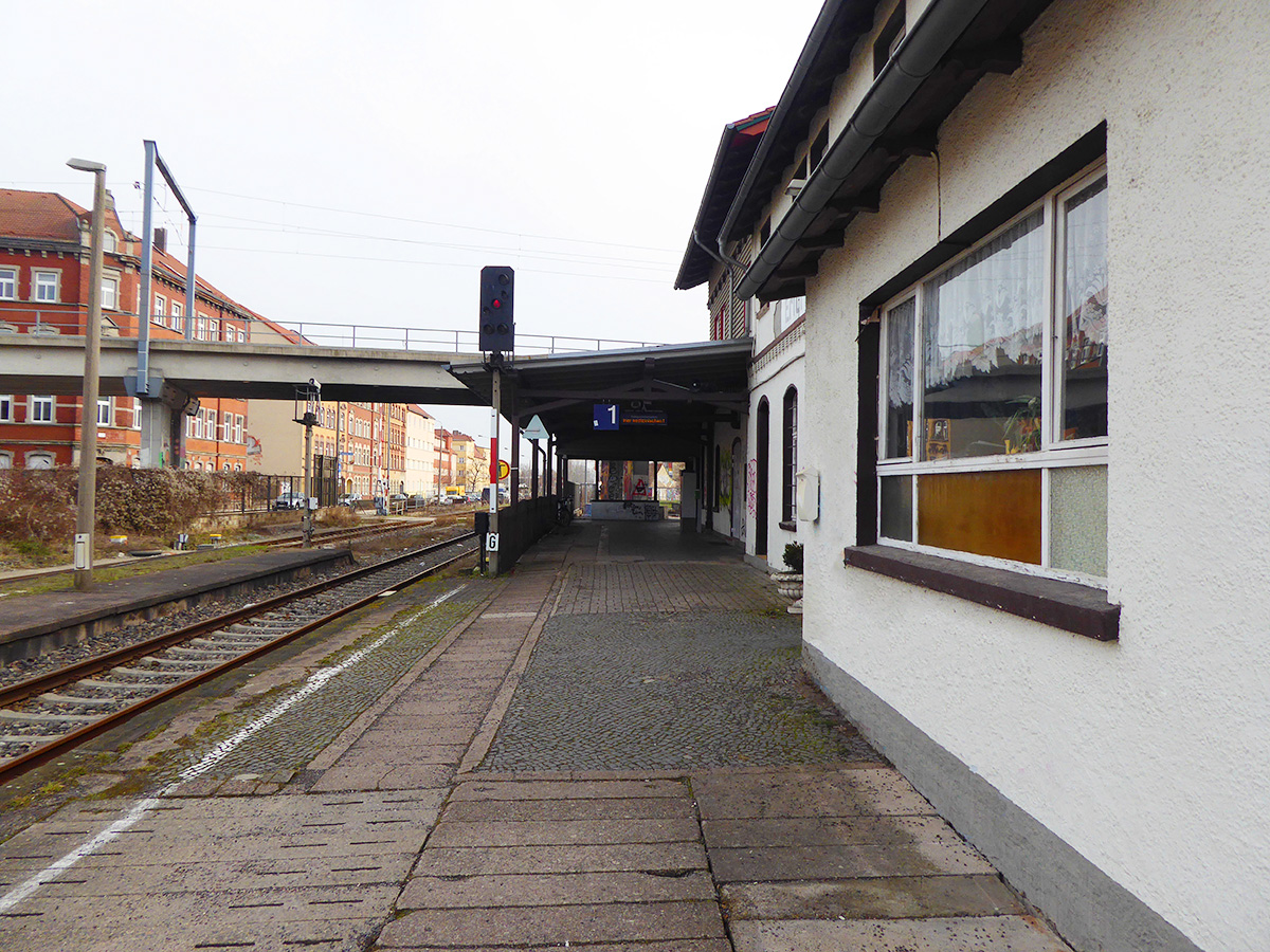 The project section (PRA) 3, section Greußen (a) - Kühnhausen (a), with the stations Straußfurt (incl. entry from direction Sömmerda - line 6721) and Ringleben-Gebesee as well as PRA 4+5 comprise the section Kühnhausen (e) - Erfurt Nord (e) with the stations Kühnhausen, Erfurt-Gispersleben and Erfurt Nord. The section boundary to the Erfurt junction is at km 66.740 (tip of turnout 957 of the Erfurt Dieselstraße junction) approx. 1 km after the Erfurt Nord station.