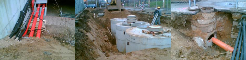 200m Trinkwasser DN 200 GGG, 150m Schmutzwasser DN 300, 150m Regenwasser DN 900 inkl. Regenwassernutzung/Zisterne, 50m Fernwärme 2 x KMR 100/200, Anbindung Platzentwässerung PVC-U bis DN 200, inkl. diverser Hausanschlüsse