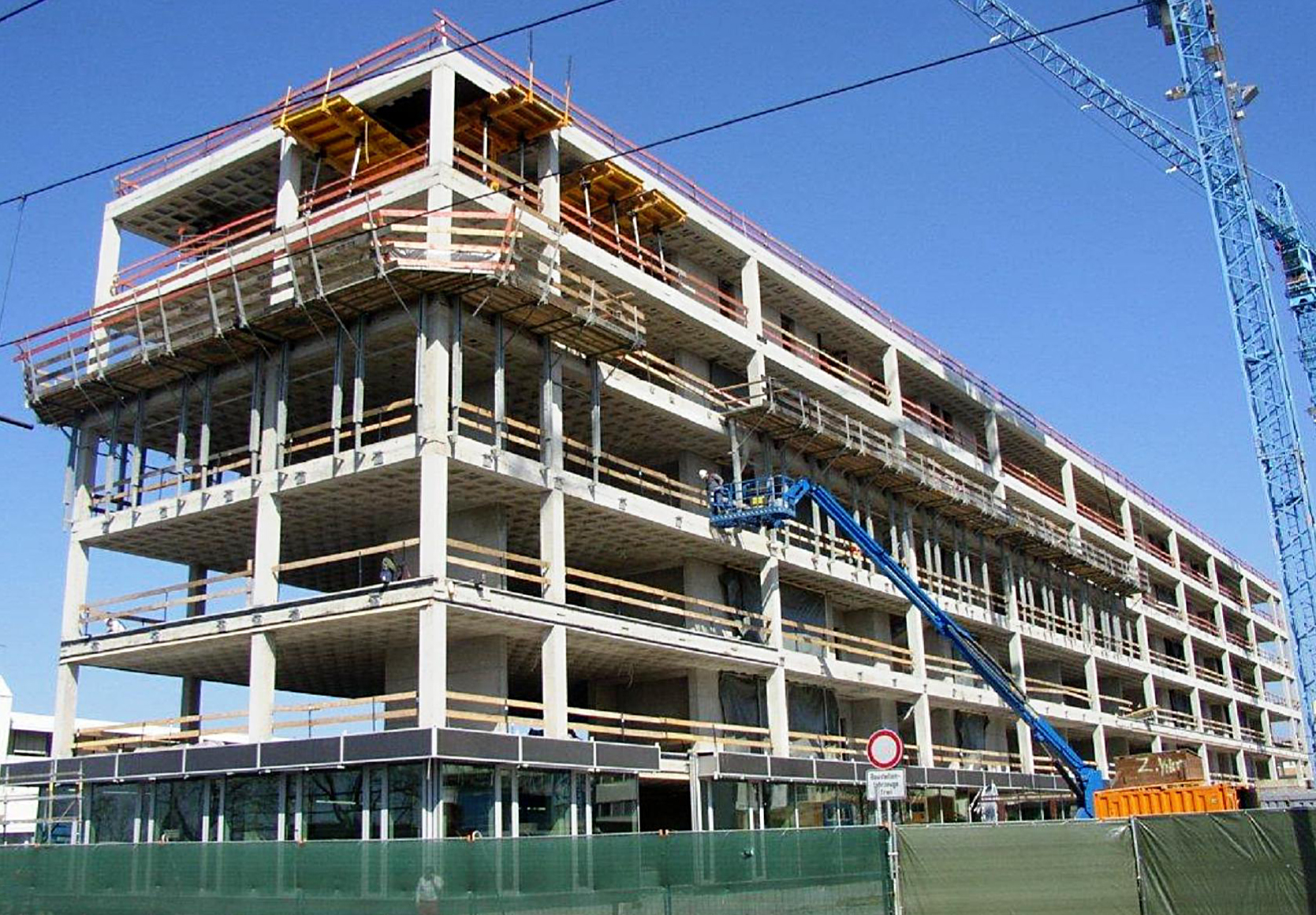 In the course of the project „Extension of Production Patient Care Mannheim“ a new building with production and logistic handling area will be constructed on the premises of the firm Roche Diagnostics GmbH. The multi-storey building will be constructed as steel skeleton building and consists of the basement with an energy tunnel below, the 1. Floor, three upper floors and a service floor. The high rack storage facility of reinforced concrete has 6 alleys, three of which are provided as refrigerated alleys. The entire building complex (multi-storey building and high rack storage facility) will have complete sprinkler protection.