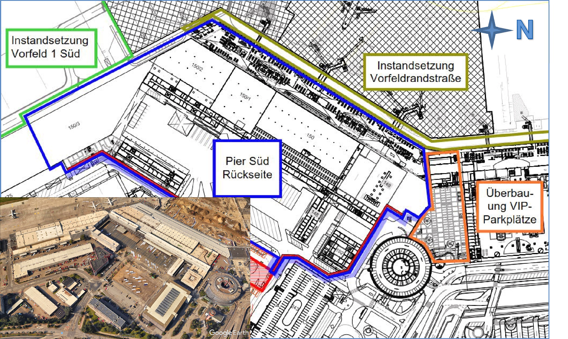 Die rückzubauenden Gebäude befinden sich im zentralen Bereich des Flughafens in unmittelbarer Nähe zu verbleibenden Bestandsgebäuden und der Vorfeldfläche des Flughafens. Es erfolgt ein Rückbau unter Flugbetriebsbedingungen.