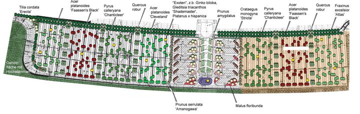 - Parkflächenbe- und eingrünung – Pflanzung von 673 Stück Hochstämmen einschl. Unterpflanzung im Parkplatzbereich