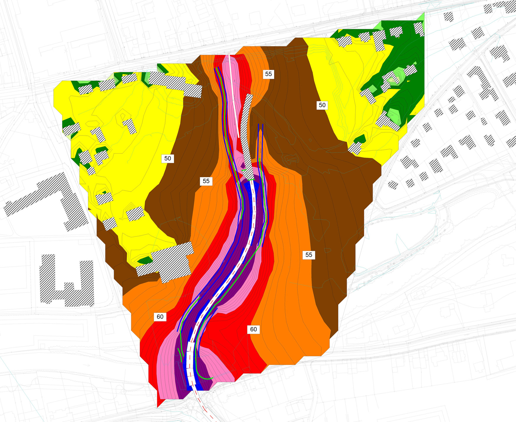 - Einarbeitung der drei geplanten Tunnelvarianten in ein Schallberechnungsprogramm und Digitalisieren der für die Ausbreitungsrechnung maßgeblichen örtlichen Gegebenheiten.